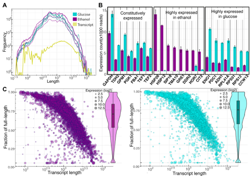 2、葡萄糖生長(zhǎng)條件下的酵母共計(jì)獲得~509 MB(59X)數(shù)據(jù)量,包含約530,000高質(zhì)量reads,其中N50為1150bp;酒精條件下的酵母共計(jì)獲得~623 MB(72X)數(shù)據(jù),約623000 高質(zhì)量reads,其中N50為1263 bp;