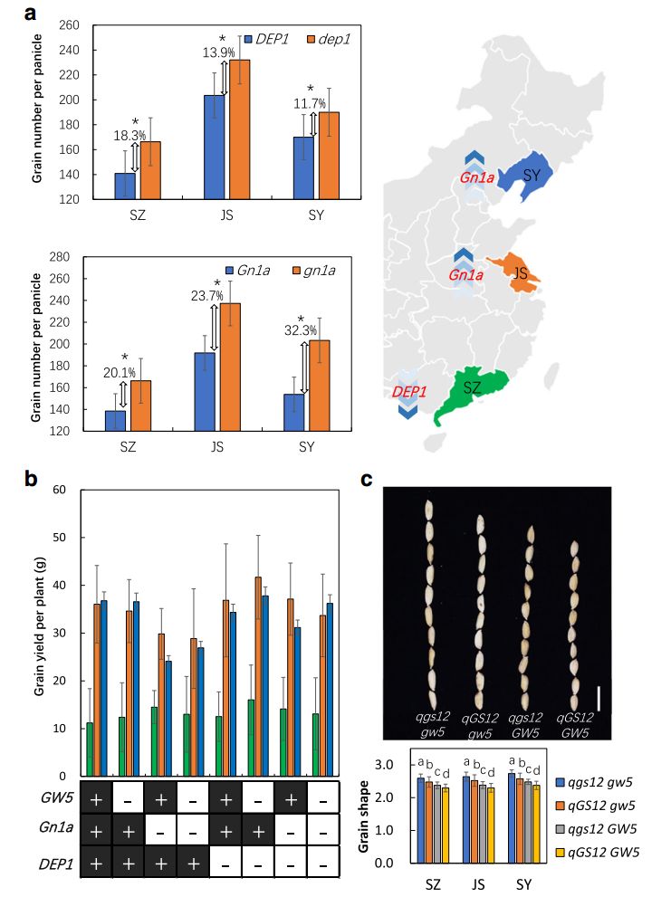 為了揭示生態(tài)環(huán)境與遺傳背景對(duì)基因功能的影響,首先,作者發(fā)現(xiàn)Gn1a對(duì)水稻單穗籽粒數(shù)目的貢獻(xiàn)主要集中在江蘇與沈陽(yáng)兩個(gè)實(shí)驗(yàn)點(diǎn),而DEP1僅僅在深圳被檢測(cè)到是控制單穗籽粒數(shù)目的QTL(圖6)。對(duì)以上三個(gè)種植區(qū),又進(jìn)一步比較攜帶有 DEP1/dep1與Gn1a/gn1a的不同水稻材料,結(jié)果發(fā)現(xiàn)在高緯度生態(tài)區(qū)dep1對(duì)單穗籽粒數(shù)目的貢獻(xiàn)減少,而gn1a對(duì)其貢獻(xiàn)明顯增強(qiáng)(圖6)。類(lèi)似地,DTH8、 SDG708與PHYB在江蘇均被檢測(cè)到,而PHYB在深圳也被檢測(cè)到,同樣, DTH8、 SDG708在沈陽(yáng)也被檢測(cè)到;結(jié)果顯示DTH8、SDG708幾乎不會(huì)影響在深圳的抽穗期,PHYB在沈陽(yáng)有較弱的作用(圖6)。概括起來(lái),Gn1a、 SDG708、SD1與GW5的功能在高緯度地區(qū)被增強(qiáng),另一方面,PHYB與DEP1的功能隨著緯度的北移被破壞,有趣的是,DTH8在中緯度地區(qū)具有較強(qiáng)的功能,緯度的南移或北移都會(huì)削弱其功能。