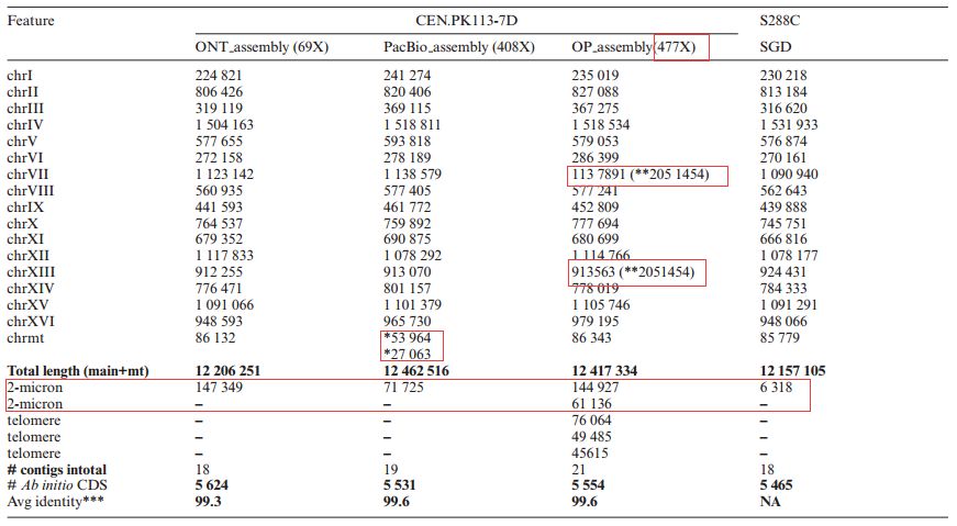 對于不同測序平臺得到的基因組數(shù)據(jù),采用 3 種組裝方式:只用 MinIon 得到的數(shù)據(jù)進(jìn)行 de nove組裝得到 ONT_assembly;只用 PacBio 得到的數(shù)據(jù)進(jìn)行 組裝得到 PacBio_assembly;用 MinIon和 PacBio 得到的數(shù)據(jù)共同進(jìn)行 de nove 組裝得到 OP_assembly。然后使用 Illumina 的數(shù)據(jù)對組裝結(jié) 果進(jìn)行校正。三種組裝方式得到的 2μm 質(zhì)粒都比已知的 S288C 酵母的 2μm 質(zhì)粒更長,而ONT_assembly 的組裝結(jié)果很好,剛好組裝出 16 條染色體,1個線粒體序列,1個質(zhì)粒序列;PacBio_assembly 組裝的線粒體序列是斷裂開的兩段;OP_assembly 組裝出的 contigs 最多,多出 3個端粒 DNA 片段,2 個質(zhì)粒片段,而且組裝時把 VII 染色體和 XIII 染色體的端粒區(qū)域連接在了一 起。 總體來看,三種組裝方式得到的基因組很相近,由于 OP_assembly 的測序深度最高,與 S288C酵母的平均比對率達(dá)到了 99.6%。