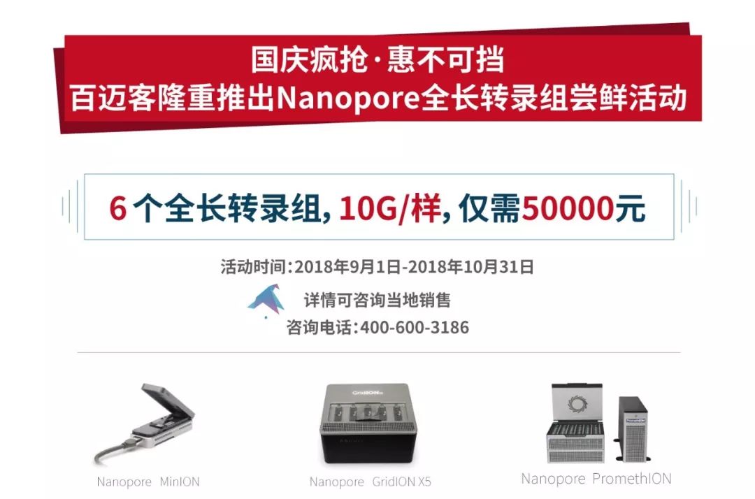 今年8月份牛津納米孔公司與百邁客公司達(dá)成長期合作,已引入Oxford Nanopore平臺,擁 有 MinION、GridION X5 和 PromethION 三種型號全套納米孔測序儀。
