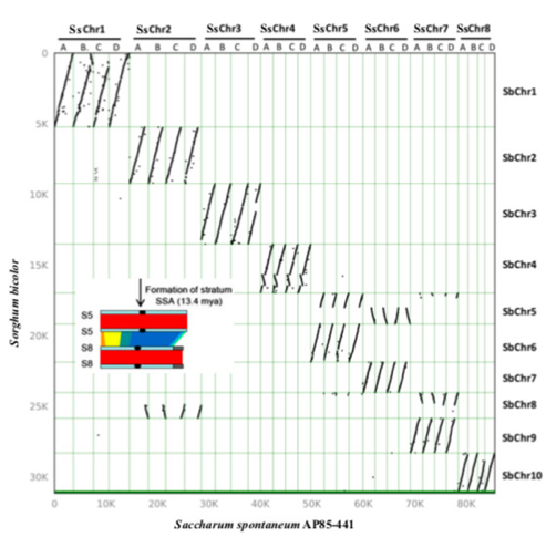 AP85-441基因組的組裝顯示了S.spontaneum的染色體數(shù)目從10降到8,而這與頻繁復(fù)制的古復(fù)制染色體對(duì)相關(guān),通過與高粱的聚類比對(duì),發(fā)現(xiàn)高粱祖先5染色體和8號(hào)染色體同源物經(jīng)歷了染色體裂變(圖2)。SbChr05(A12)的祖先染色體斷裂分為兩個(gè)主要部分,即C5S(A12S)和C5L(A12L),分別轉(zhuǎn)移到SbChr06(A2)和SbChr07(A5)的祖先染色體;SbChr8(A11)的祖先染色體斷裂為兩個(gè)主要的部分,即C8S(A11S)和C8L(A11L),分別轉(zhuǎn)移到SbChr09(A6)和SbChr02(A7+ A9)的祖先染色體中。SbChr8和SsChr5之間及SbChr5和SsChr7之間近乎同源的短片段是在高粱與甘蔗分化前,高粱SSA形成于13.4MYA同源基因的殘留物,同時(shí)發(fā)現(xiàn),S5中較小的SSA區(qū)域和S8中SSA的較大區(qū)域在重排的AP85-441基因組中也是保守的。