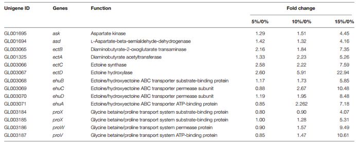 對菌種進行二代測序,篩選FDR<0.01,F(xiàn)old Change≥2的基因為差異表達基因,并使用COG、GO、KEGG、Swissport和NR數(shù)據(jù)庫進行注釋分析。通過COG分類,共獲得25個COG組別,其中氨基酸轉(zhuǎn)運和代謝、碳水化合物轉(zhuǎn)運和代謝是其主要組分。DEGs被分布在34個GO term里,其中包括細胞組分、分子功能和生物過程三大類。與此同時,三個比較組(5%/0%, 10%/0%和15%/0%)差異表達基因分別富集到77、32和90條KEGG通路中,其中ABC轉(zhuǎn)運受體,甘氨酸、絲氨酸和蘇氨酸代謝在鹽刺激下扮演相當(dāng)重要的角色。尤其在最大耐受度的NaCl鹽環(huán)境里,參與ABC轉(zhuǎn)運受體通路的四氫嘧啶和羥基四氫嘧啶基因、甜菜堿基因和四氫嘧啶和羥基四氫嘧啶合成基因表達量都顯著提高。