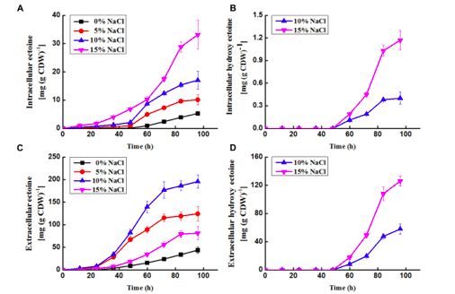 除此之外,對胞外的四氫嘧啶和羥基四氫嘧啶含量進行檢測并發(fā)現(xiàn)大量的四氫嘧啶被釋放到細胞外。96h后,在0、10%和15%的鹽濃度環(huán)境下,分別釋放了89.20%、92.46%、91.99%和71.09%的四氫嘧啶。在10%和15%的鹽濃度環(huán)境下,有99.31%和99.08%的羥基四氫嘧啶被釋放到胞外。在15%的鹽濃度環(huán)境下,四氫嘧啶的轉(zhuǎn)運能力顯著增強,而羥基四氫嘧啶的轉(zhuǎn)運能力則隨著濃度的增加未出現(xiàn)顯著變化。此外,研究表明,將四氫嘧啶轉(zhuǎn)化為羥基四氫嘧啶的能力會隨著鹽濃度的增加而增強,在15%的鹽濃度環(huán)境下,有50%的四氫嘧啶轉(zhuǎn)化為羥基四氫嘧啶,并在10%和15%的鹽濃度環(huán)境下,四氫嘧啶和羥基四氫嘧啶的胞外含量最高。