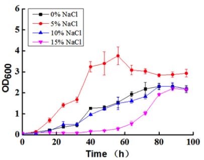 隨著鹽濃度的增高,菌落顏色由黃色變?yōu)榘咨?,且?%的NaCl鹽溶液中生長最佳,鹽濃度高于或低于該濃度,其生長速度均會下降。