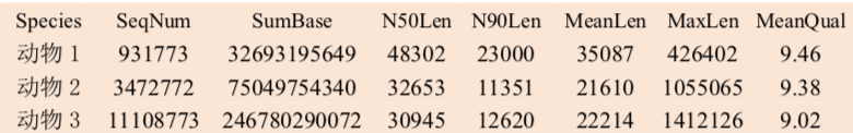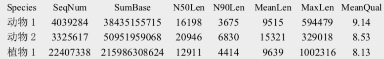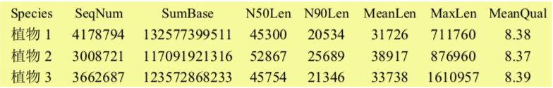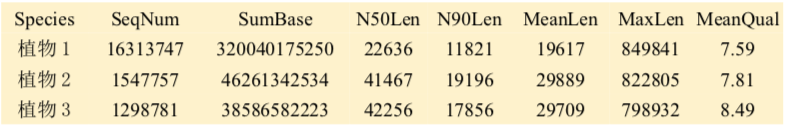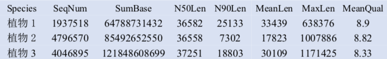 注:Species:分析的物種信息;SeqNum:各個(gè)長(zhǎng)度范圍內(nèi)序列的數(shù)目;SumBase:指各個(gè)長(zhǎng)度范圍內(nèi)序列的總長(zhǎng)度;N50Len:reads N50長(zhǎng)度;N90Len:readsN90長(zhǎng)度;MeanLen:平均reads長(zhǎng)度;MaxLen:最長(zhǎng)reads長(zhǎng)度;MeanQual:質(zhì)量值,準(zhǔn)確度=1-10^(-Q/10)