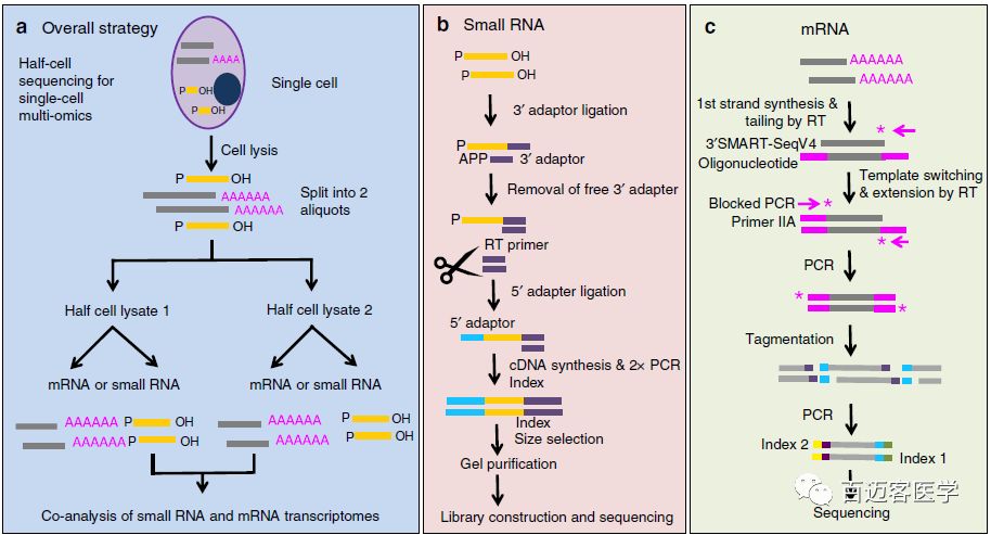 a 基于半細(xì)胞的單細(xì)胞miRNA-mRNA共測(cè)序的實(shí)驗(yàn)流程; b 單獨(dú)的scmiRNA-seq流程;c 單獨(dú)的scRNA-seq流程