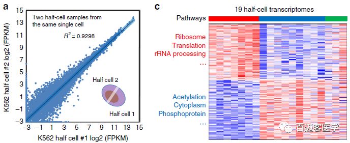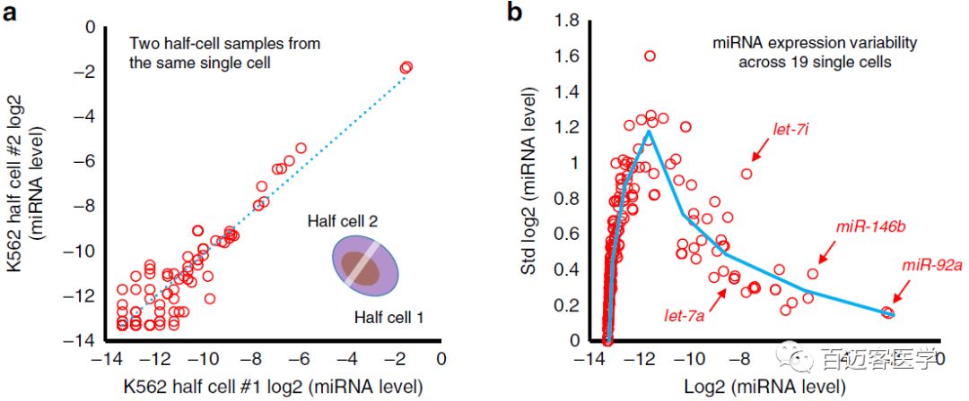 1、作者首先分別比較了來(lái)自同一細(xì)胞的半細(xì)胞單細(xì)胞microRNA測(cè)序和單細(xì)胞轉(zhuǎn)錄組測(cè)序之間的差異:該方法表現(xiàn)出良好的穩(wěn)健性(~95%成功率)和重現(xiàn)性(microRNA和mRNA的R2=0.93),產(chǎn)生可獨(dú)立驗(yàn)證的成對(duì)半細(xì)胞microRNA和mRNA表達(dá)譜。