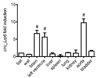divergent primer擴增cDNA和gDNA,驗證其來源于可變剪接;RNAse R抗性檢測;放線菌素D處理抑制轉(zhuǎn)錄證實circRNA的穩(wěn)定性(更長的turn-over時間);qRT-PCR檢測各組織中circ_Lrp6表達(dá)水平并結(jié)合RNA-seq數(shù)據(jù)進(jìn)行分析:circ_Lrp6和Lrp6在血管中富集。