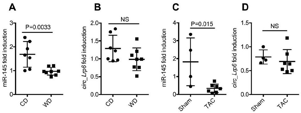 不同病理狀況circ_Lrp6和miR-145表達(dá)分析:例如動脈粥樣硬化血管患者中,miR-145的表達(dá)顯著降低,但circ_Lrp6沒有顯著變化,在復(fù)雜的病理學(xué)中兩個ncRNA在基因表達(dá)方面解離。