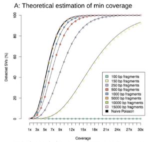 根據(jù)兩個人類數(shù)據(jù)集的錯誤情況和read長度,作者對兩條人的染色體模擬了50X?Pacbio?和ONT?read 。純粹的統(tǒng)計分析發(fā)現(xiàn),近10X覆蓋度的數(shù)據(jù)(平均長度10kb)就足夠去推斷所有SV斷點(一瞬間覺得自己可以省好多錢有木有),然而對于100bp的短read雙端測序至少要25X覆蓋度。當(dāng)前這個統(tǒng)計只是一個理想情況,比如缺乏了重復(fù)和覆蓋度的偏移,因此是低估了所需的覆蓋度的。