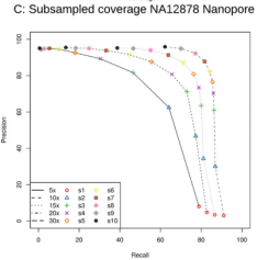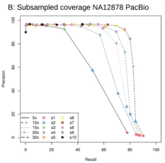 理想很豐滿、現(xiàn)實很骨感!理想情況下用10x覆蓋度測三代read就能檢測出來所有的結(jié)構(gòu)變異,但是現(xiàn)實肯定不夠啦~ 作者對真實的Pacbio 55X數(shù)據(jù),和Nanopore 28X數(shù)據(jù)所檢測到的SV和低深度下所檢測的SV進行比較。對于Pacbio數(shù)據(jù),15X的時候?qū)τ贜A12878和SKBR3樣品的SV能識別到69.64%和67.24%,如果提升到30X時,可分別識別到80.05%和76.63%。SKBR3的識別率相對較低主要因為它是癌癥樣品,有些極端的拷貝擴增。所以癌癥樣品要想識別到更多更準的SV,需要適當(dāng)提升測序深度。