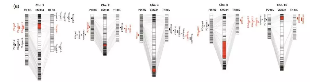 QTL定位結(jié)果:利用120個PD單株構(gòu)建的重測序遺傳圖譜和3個環(huán)境下的56個單株表型數(shù)據(jù)定位到22個QTL位點(diǎn)。其中LOD值最高的是PD-dicap1.1 (LOD=8.7),表型變異率(R2)最高的是PD-dicap10.2 (28.8%)。同樣地,85個TH單株構(gòu)建的簡化圖譜和2個環(huán)境的表型數(shù)據(jù)定位到22個QTL位點(diǎn)。其中LOD值(LOD=9.9)和R2(18.8%)最高的都是TH-cap2.2。兩者分析時均用CM334作為參考基因組,因此可以對2個群體的QTL定位結(jié)果進(jìn)行比較,發(fā)現(xiàn)PD群體的9個QTL位點(diǎn)與TH群體的7個QTL位點(diǎn)的物理位置重疊。