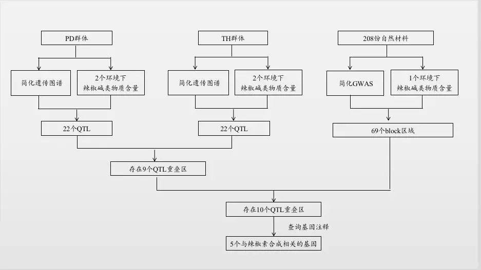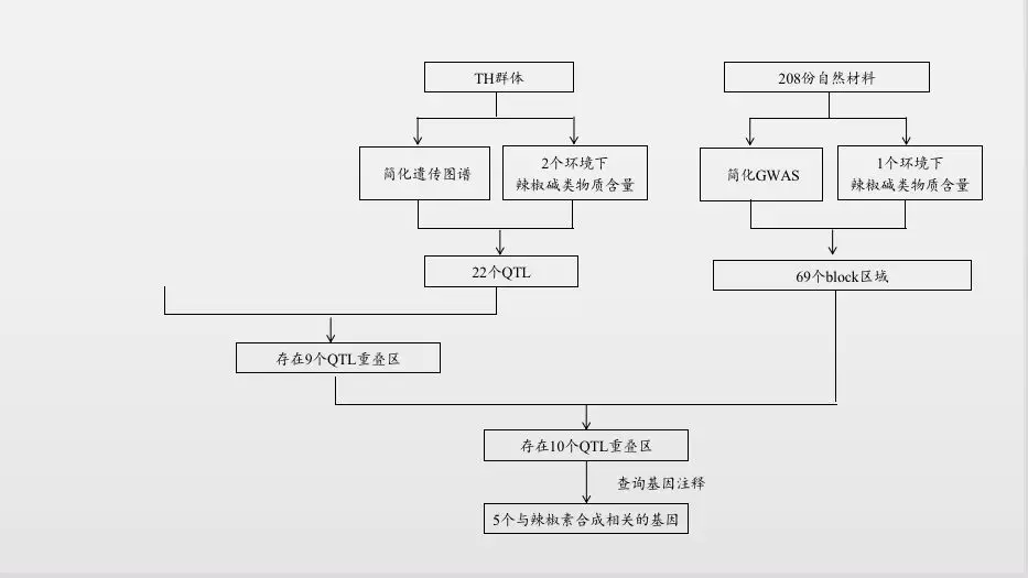 聯(lián)合分析結(jié)果:基于相同的參考基因組,通過比較QTL分析與GWAS分析的定位結(jié)果的物理位置發(fā)現(xiàn)GWAS結(jié)果中10個區(qū)域與本研究QTL定位結(jié)果重疊,查詢注釋結(jié)果,發(fā)現(xiàn)5個基因與辣椒素生物合成途徑相關(guān)基因。