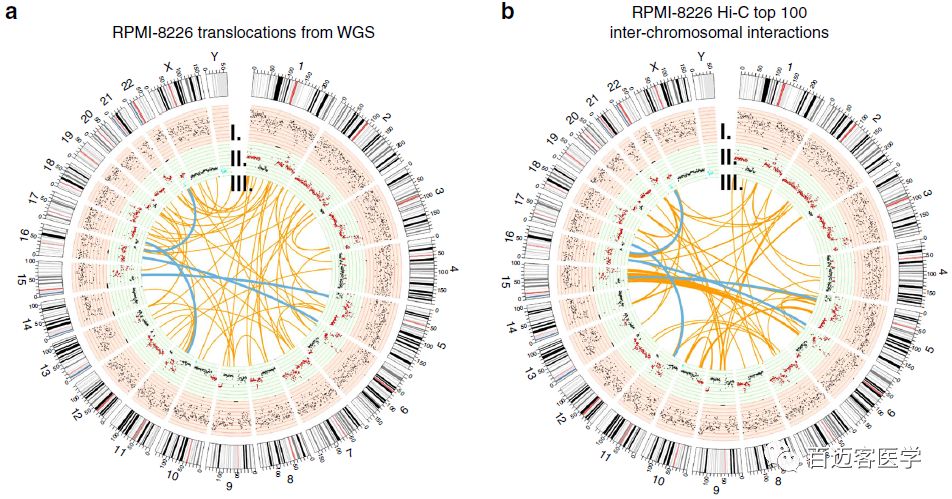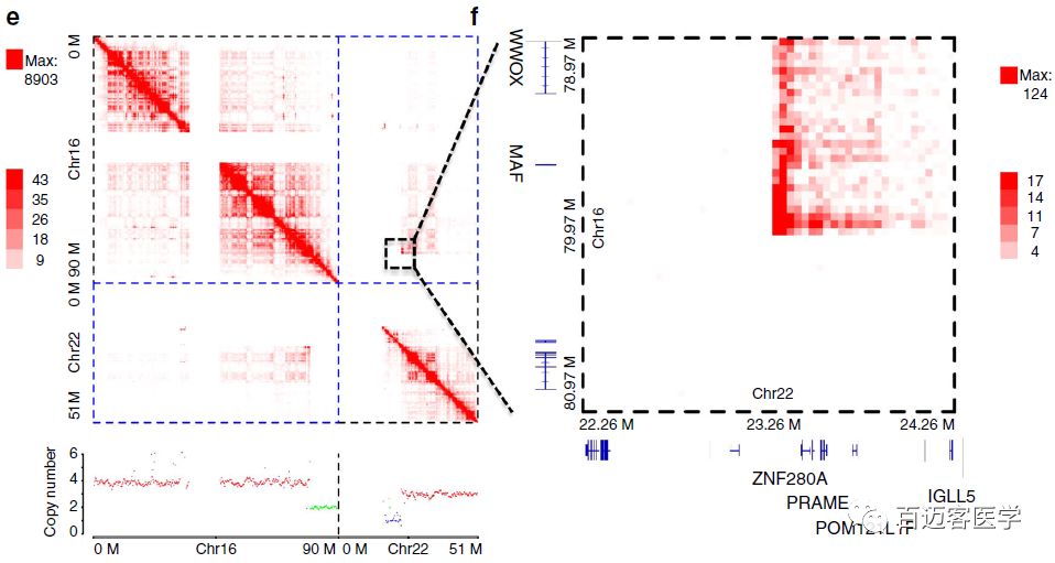 在RPMI-8226中,WGS鑒定出56個(gè)染色體間易位事件,其中四個(gè)也在top?100的Hi-C染色體間互作中,其中包括RPMI-8226的光譜核型(SKY)圖像中檢測(cè)到t(16,22)(q23,q11)的易位,涉及MM相關(guān)基因WWOX和MAF。在U266細(xì)胞中,鑒定到了80個(gè)受易位事件影響的基因,包括癌癥相關(guān)基因TNIK、FBXW7、TRIM2,其中包含一些之前研究未發(fā)現(xiàn)的MM相關(guān)基因。此外距離易位位點(diǎn)1 Mb的基因中,有一半以上是相比于正常B細(xì)胞差異表達(dá)的。MM細(xì)胞系的染色體間整體互作count明顯高于正常B細(xì)胞??偟膩?lái)說,這些結(jié)果表明,癌細(xì)胞基因組三維構(gòu)象受到染色體間易位的影響。