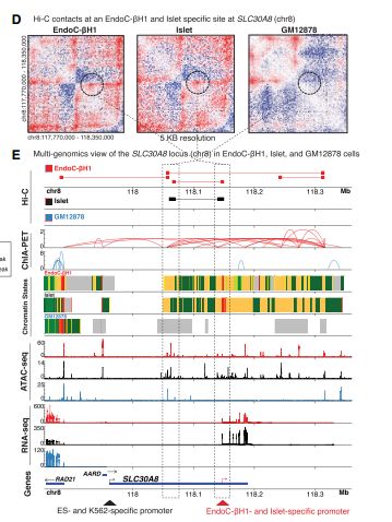 多組學分析結(jié)果在不同細胞中的比較。Hi-C互作表明在 EndoC-bH1 和人原代胰島SLC30A8位點有特異性loop,但在GM12878中缺乏。