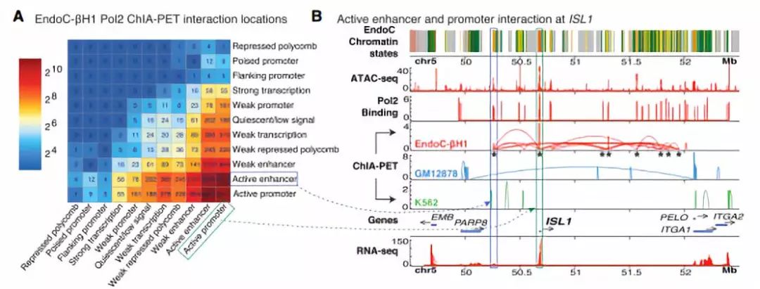 為示意功能性順式調(diào)控網(wǎng)絡(luò),文中在EndoC-bH1中采用RNA聚合酶(Pol2)ChIA-PET,鑒定了25,336個推定的Pol2介導的染色質(zhì)互作。進一步過濾,與ATAC-seq OCRs取交集,得到16,756個互作,大多數(shù)與活性增強子和啟動子關(guān)聯(lián)。且與已在人胰島中報道過的互作一致,包括 ISL1和PDX1位點。