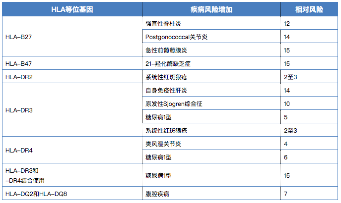 1972年Russel報告銀屑病(牛皮癬)患者攜帶HLA-B13或HLA-B17。此后陸續(xù)發(fā)現(xiàn)大量其它疾病與特定的HLA相關(guān),其中,HLA-B27抗原見于大約90%的強直性脊椎炎病人,由此HLA-B27在臨床檢測中作為強直性脊柱炎的標志物,以至使HLA分型具有了診斷價值,甚至,能較早地證實疾病亞型之間的臨床區(qū)別,例如,尋常銀屑病與HLA相關(guān),而膿皰性銀屑病則不然;青少年性胰島素依賴型糖尿病與HLA-B8、HLA-Bw15和HLA-B18相關(guān),而晚期發(fā)作型糖尿病并無這種相關(guān)性。因此,特定類型的HLA便成為某些疾病的遺傳標志。在疾病研究的延伸面,是關(guān)于HLA與長壽的關(guān)系,目前亦形成一個新的研究熱點。目前研究比較清楚的幾個HLA與自身免疫疾病相關(guān)關(guān)系如下表: