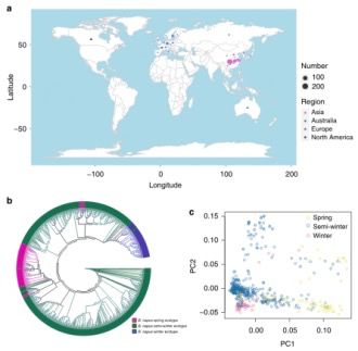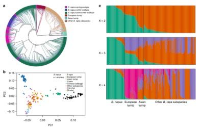 作為較早的異源多倍體作物之一,B.napus通過B. rapa和B.oleracea雜交形成,估計甘藍型油菜(B.napus)的形成時間為~6700和~7500年前及38000-51000年前。文獻中記載,冬季甘藍型油菜首次在歐洲種植,大約在1700年,春季甘藍型油菜開始種植并在18世紀(jì)末傳播到英國,半冬生態(tài)型主要在中國種植,在1930 – 1940年間從歐洲引入。然而,并沒有真正已知的野生甘藍型油菜(B.napus)群體,導(dǎo)致雜交形成B.napus的兩個祖先種的√確身份仍然難以捉摸,因為B. rapa和B. oleracea具有形態(tài)多樣的亞種,并且通常在整個歐洲種植了幾百年。這些物種之間的天然雜交偶然性地在適當(dāng)?shù)臈l件下發(fā)生。雖然最近的一項研究表明甘藍型油菜(B.napus)的A亞基因組可能來源于歐洲蕪菁(B. rapa ssp. rapa)的祖先,但是由于僅5份B.napus和27份?B. rapa種質(zhì)被納入該項分析中,因此需要提供更多支持該結(jié)論的證據(jù)。先前基于細胞核和葉綠體標(biāo)記的研究也表明,甘藍型油菜可能是從蘿卜和西蘭花之間的種間雜交發(fā)育而來,或是由幾個獨立的雜交事件形成的。為了進一步了解甘藍型油菜的進化,有必要揭示野生種或馴化種的供體是否是親本祖先,其中B. rapa和B. oleracea亞種參與甘藍型油菜的形成。