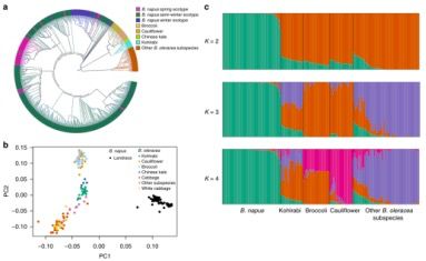 基于*佳模型(Bna, BraA和BolC SNPs集合分別采用GTR+F+ASC+R5, GTR+F+ASC+R7?和?TVM+F+ASC+R8模型),利用IQ-TREE構(gòu)建(ML) trees(圖1a,2a,3a),結(jié)果顯示,B. napus和B. rapa,B. oleracea各自具有一個分枝。大部分甘藍型油菜(B.napus)依據(jù)生態(tài)型聚類到一起,而B. rapa和B. oleracea的聚類主要反映了亞種間的關(guān)系。BraA的系統(tǒng)發(fā)育關(guān)系顯示,甘藍型油菜(B.napus)的親緣關(guān)系更接近于European turnip(歐洲蕪菁),并與B. rapa?ssp.?rapa?(亞洲蕪菁)及其它亞種親緣關(guān)系較遠(圖2a),而這正與最近的一項研究結(jié)果相一致,即甘藍型油菜(B. napus)的A亞基因組是從歐洲蕪菁的祖先進化而來的;通過動態(tài)演化情境模擬進一步分析顯示,在大約~106-1,170年前,從歐洲蕪菁到甘藍型油菜A亞基因組發(fā)生了基因交流(fastsimcoal2);PCA主成分分析顯示,甘藍型油菜地方品種(B. napus?landraces,n = 50,1980年前登記)更接近歐洲蕪菁(n = 33)(圖2b)。群體結(jié)構(gòu)分析顯示,當(dāng)K=2時,為佳的分群數(shù)(圖2c),其明確的將甘藍型油菜的地方品種與歐洲蕪菁分開,進一步支持了甘藍型油菜A亞基因組的進化歷史。