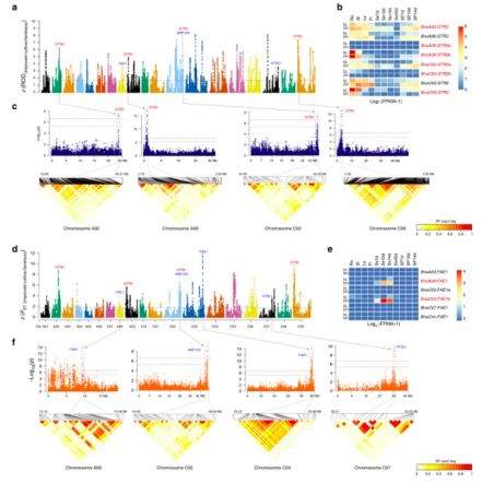 為了鑒定與11個農(nóng)藝性狀相關(guān)的候選基因,研究人員利用了多位點隨機混合線性模型mrMLM v1.3進行全基因組關(guān)聯(lián)分析研究(genome-wide association studies)。為了獲得高質(zhì)量的SNPs,研究人員對Bna SNP集合進行了估算,保留了670,028個SNP,MAF> 5%,用于后續(xù)的GWAS分析。通過19個樣品多態(tài)性核苷酸和Sanger測序結(jié)果的評估比較,表明98.74%的推算基因型是正確的,20份種質(zhì)的兩個生物學(xué)重復(fù)推算的與真實的基因型的平均系數(shù)(r2)為0.956,最小值和最大值范圍從0.928到0.967,進一步證實推算的基因型的z確性。最終共計鑒定了與10個目標(biāo)性狀顯著相關(guān)的60個位點,其中5個與種子產(chǎn)量相關(guān),3個與長角果長度相關(guān),4個與油脂含量相關(guān),48個與種子質(zhì)量相關(guān)(圖4c),此外,3個位點在閾值范圍內(nèi)顯示與開花時間相關(guān),與種子質(zhì)量性狀顯著相關(guān)的SNPs解釋了14.30%?到35.47%的表型變異,高于種子產(chǎn)量(16.81%)和含油量(20.64%),此外,本研究中還檢測到與先前的GWAS研究中與種子質(zhì)量相關(guān)的大部分基因座。由于與油含量和產(chǎn)量的相關(guān)性狀是復(fù)雜的并容易受到環(huán)境變化影響,研究人員將本研究中重要的基因座位與前期研究的QTLs位點進行了整合。因此,在受選擇區(qū)與QTLs定位區(qū)域內(nèi),基于功能注釋和轉(zhuǎn)錄組分析控制不同性狀的候選基因被鑒定,如下分析。