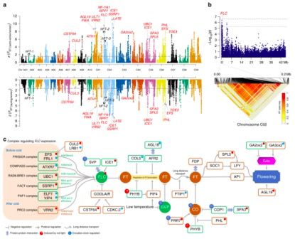 研究人員在FLOR-ID(FLOweRing Interactive Database)中檢索到了306個基因與擬南芥開花時間相關(guān),在甘藍型油菜中鑒定了1,225個直系同源基因。在兩組比對中,24?個開花時間相關(guān)基因同時坐落在受選擇區(qū)域中(圖5a,c),其中22個分布在C亞基因組上,主要通過春化和光周期途徑調(diào)節(jié)開花時間。特別地,FLC基因座及其染色質(zhì)介導(dǎo)的調(diào)節(jié)原件將是調(diào)控甘藍型油菜開花時間的*有希望的靶標(biāo)。