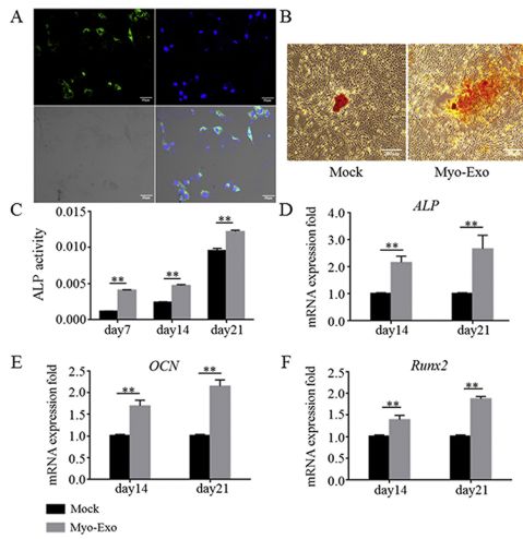 1、C2C12成肌細(xì)胞分泌的外泌體可以進入前成骨細(xì)胞MC3T3-E1,促進其成骨分化。