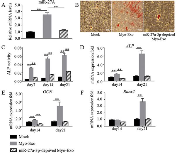 將外泌體標(biāo)記與MC3T3-E1共孵育,觀察到這類外泌體(myo-exosomes)能夠被MC3T3-E1細(xì)胞攝入。并且MC3T3-E1細(xì)胞的成骨分化也能夠被促進,表現(xiàn)為增強的ALP活性,基質(zhì)礦化增強,與標(biāo)記基因ALP/OCN/RUNX2表達上調(diào)。對C2C12成肌細(xì)胞分泌的外泌體進行小RNA測序,基于測序結(jié)果,鑒定出來的miRNA進行共有分析,其中有12個miRNA分子高表達,一些功能被證實的與成骨相關(guān)的miRNA分子,例如miR-27a-3p也包括在內(nèi)。