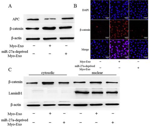 在成骨分化過程中,Wnt/β-catenin pathway起到重要作用,APC作為該通路的負(fù)調(diào)節(jié)蛋白已被證實直接受miR-27a-3p調(diào)控。MC3T3-E1攝入外泌體后,APC的表達受到明顯抑制,β-catenin的表達顯著升高且被激活。當(dāng)miR-27a-3p敲低后,外泌體對APC-β-catenin pathway沒有影響。