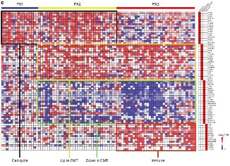 該研究共鑒定到11340個(gè)不同的基因產(chǎn)物,覆蓋了腫瘤細(xì)胞及腫瘤微環(huán)境所有可能表達(dá)的蛋白。研究人員對(duì)胃癌與癌旁組織全蛋白表達(dá)譜進(jìn)行聚類(lèi)分析,將彌漫型胃癌分為三個(gè)分子亞型(PX1~3),且這三個(gè)亞型與生存預(yù)后和化療敏感性密切相關(guān)。這是世界上實(shí)現(xiàn)在蛋白層面上對(duì)腫瘤進(jìn)行分子分型,且分的的亞型與預(yù)后和化療有顯著性關(guān)聯(lián)。其中PX1型(細(xì)胞周期型),總生存時(shí)間最長(zhǎng);PX2型 (上皮-間充質(zhì)轉(zhuǎn)化型),生存預(yù)后介于PX1和PX3之間;PX3 (免疫通路富集型)患者腫瘤組織高表達(dá)蛋白富集在免疫響應(yīng)相關(guān)通路和EMT相關(guān)蛋白上,總生存時(shí)間最短,并且該組患者對(duì)化療不敏感。