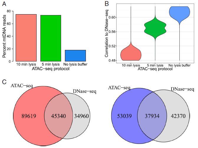 這2種方法中,不使用裂解緩沖液裂解方法(no lysis buffer),顯著降低了mtDNA污染比例,僅18%,(可能是有助于線粒體核膜保持完整)。同時(shí),增加了ATAC-seq和DNase-seq兩種方法在reads水平的一致性。后續(xù)研究中采用改進(jìn)的no lysis buffer方案進(jìn)行ATAC-seq建庫(kù)。