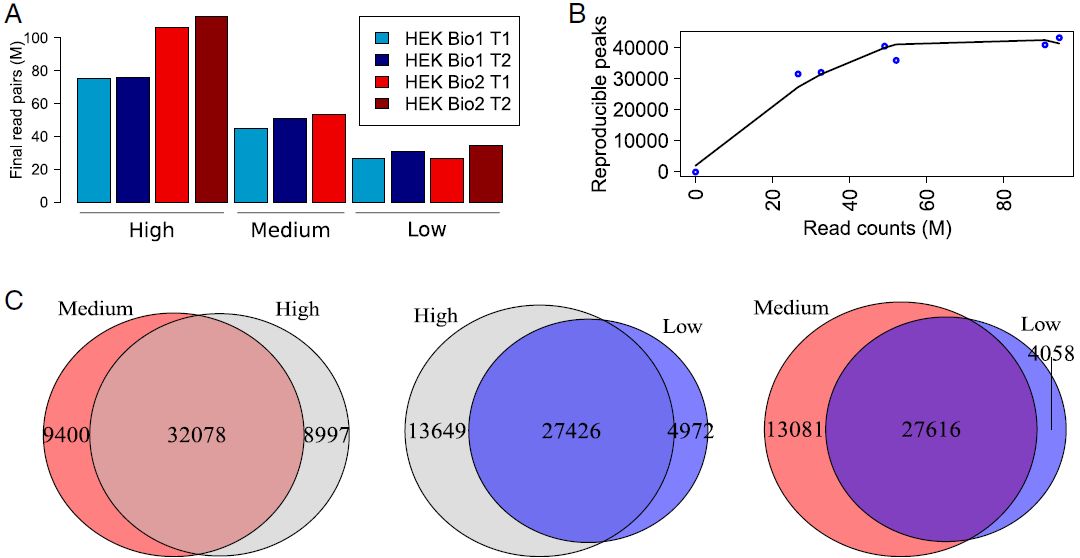 作者還探究了文庫(kù)/測(cè)序深度對(duì)揭示開(kāi)放染色質(zhì)區(qū)域的影響,高深度和中等深度的ATAC-seq鑒定了相似數(shù)量的peaks,而低深度則略微減少。具有生物學(xué)重復(fù)的低至中等深度25-50Mb reads文庫(kù)足以可靠地鑒定人細(xì)胞系中的開(kāi)放染色質(zhì)區(qū)域。