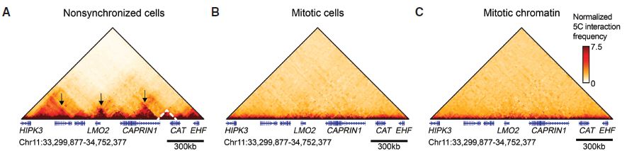 1)使用5C技術(shù),證實(shí)TAD和CTCF環(huán)很容易在間期檢測(cè)到,但在分裂前中期不存在。