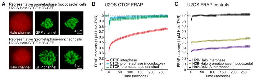 4)活細(xì)胞成像技術(shù),光漂白熒光恢復(fù)和單分子追蹤技術(shù)顯示幾乎所有CTCF染色質(zhì)結(jié)合都在分裂前中期丟失。