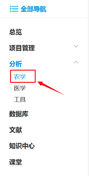首先,您需要登錄到百邁客云平臺(tái)網(wǎng)址(http://www.biocloud.net/),點(diǎn)擊全部導(dǎo)航->分析->農(nóng)學(xué)