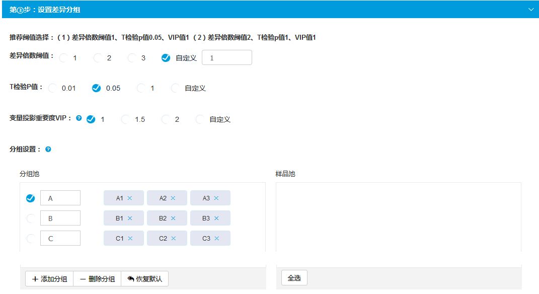 在進(jìn)行分組設(shè)置時(shí),我們可以自由添加分組,設(shè)置自己的組名,并在組名之后添加用于差異分析的樣品。