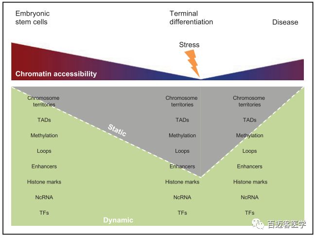 作者以此研究為基礎,結合前人研究結果,構建了發(fā)育和疾病發(fā)生中表觀基因組的變化模型(如下圖)。發(fā)育過程中伴隨著染色質的變化,使最終分化的細胞具有穩(wěn)定的轉錄組,而疾病破壞了這種平衡,通過影響染色質結構、增強子-基因loop、組蛋白修飾、DNA甲基化等,將基因組的特定區(qū)域轉變?yōu)楦鼊討B(tài)的構象。