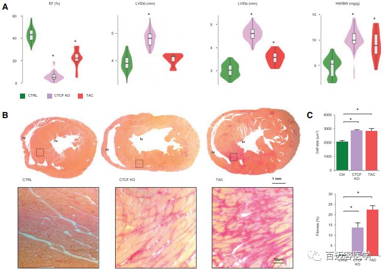 對CTCF-KO小鼠的表型呈現明顯的心肌病,失去CTCF會導致射血分數受損、左心室擴張以及器官和細胞水平的肌肉肥厚。而TAC小鼠也表現出肥厚,并伴有較輕微的心室大小和射血分數的變化,這表明CTCF-KO和TAC小鼠代表了不同的病理生理模型。