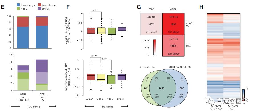 CTCF的缺失或TAC對染色體的A compartment和B?compartment的影響較小,而其中發(fā)生compartment轉換的區(qū)域與基因表達呈正相關,即從A?compartment到B?compartment轉換區(qū)域的基因表達下調,從B?compartment到A?compartment轉換區(qū)域的基因表達上調。CTCF-KO、TAC小鼠間存在41%的共有差異表達基因,兩者都表現出已知的標志基因激活。ChIP-seq檢測到CTCF靶向基因的轉錄起始位點,而這些基因富集在與心臟病相關的通路中。