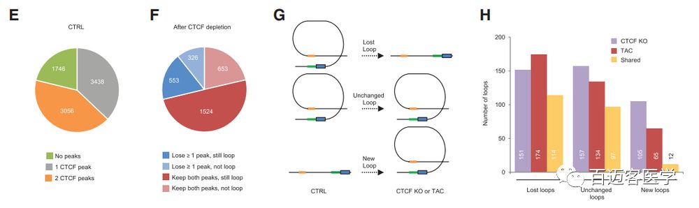 CTCF-KO、TAC小鼠的染色體長距離loop大小沒有明顯變化,但loop總數量減少。相比于對照組,CTCF-KO和TAC中消失的長距離loop中有51%兩者共有的,而新出現的loop中只有15%是兩者共有的;在疾病細胞中丟失的loop數大于新形成的loop數。在疾病細胞中發(fā)生重組(丟失/新形成)的loop中,富集與心血管功能相關通路中的基因。此外,重組loop中亦包含大量增強子–啟動子loop,其中在疾病細胞中丟失的loop富集與心臟病理相關的基因。