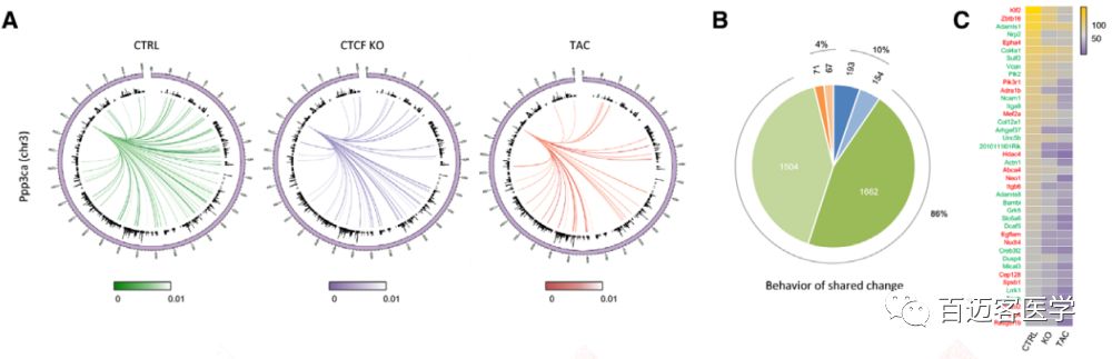 存在互作的9194個表達基因中,60%的基因在CTCF-KO和TAC中的互作變化方向相同。而剩余的40%基因中大多數(75%)是在某一組疾病細胞中虎作沒有發(fā)生變化的,25%是互作變化在兩組中相反的。在CTCF-KO和TAC中互作改變相同且差異表達的3651個基因中,絕大多數(86%)的局部互作減少(圖4B)。這些發(fā)現支持了這樣一種趨勢,即更多的動態(tài)染色質互作影響基因表達,兩組疾病細胞與對照相比,它們的基因表達變化方向更可能趨向一致。互作數量top 40的差異表達基因在疾病細胞中的互作持續(xù)下降,如與鈣依賴信號和心肌肥厚相關的基因Ppp3ca。