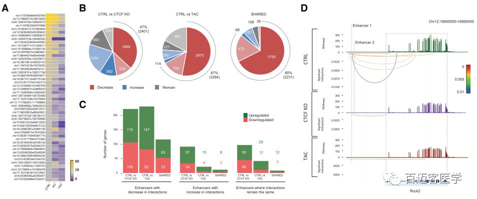 在先前鑒定的成人心肌細胞增強子中,其中有115050個再本研究中存在互作。這些增強子的互作在疾病細胞中減少。事實上,其中47%在CTCF-KO中表現出了互作減少,67%在TAC中表現出互作減少。兩種疾病細胞中共有的增強子中,85%在兩者中均出現互作減少。且兩種疾病細胞中基因表達變化與其增強子-基因互作的減弱有關,且受影響的基因在心臟病理通路中富集,如Rock2。