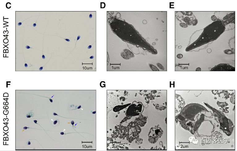 形態(tài)學(xué)分析顯示嚴(yán)重的完全畸形精子癥,主要的異常是嚴(yán)重的無(wú)定形頭,具有空泡和過(guò)剩的殘留細(xì)胞質(zhì)(圖1F)。來(lái)自兩兄弟的精子在頭部出現(xiàn)畸形(圖1G和H)。精子呈現(xiàn)較大的無(wú)定形頭和腔隙染色質(zhì)缺陷(空泡),具有豐富的殘留細(xì)胞質(zhì)。