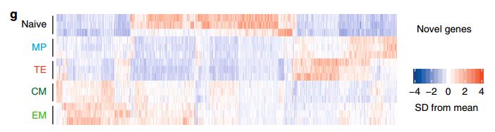 從LCMV感染小鼠中分離病毒特異性的CD8+T細(xì)胞亞群,對不同類型的細(xì)胞進行RNA-seq。包括初始T細(xì)胞、終末分化效應(yīng)T細(xì)胞(short-livedterminal effector ,TE)、記憶前體T細(xì)胞(memory precursor ,MP)、中心記憶T細(xì)胞(central memory ,CM) 、效應(yīng)記憶T細(xì)胞(effector memory ,EM)?;跀?shù)據(jù)組裝分析,共鑒定到13909個unique genes,75%是蛋白編碼基因,25%是非編碼。在非編碼基因中,三分之一在數(shù)據(jù)庫中未收錄,因為認(rèn)為是新基因。這些新基因比已注釋非編碼基因有較高的表達(dá)水平,但這兩類基因均比編碼基因低表達(dá)。采用CPAT進行編碼潛能分析,大部分新轉(zhuǎn)錄本包括單個外顯子,不到25%的新轉(zhuǎn)錄本包括2個及以上外顯子。雖然不具有蛋白編碼潛能,但大部分新基因在CD8+T細(xì)胞分化過程中表現(xiàn)出特異性,包括記憶細(xì)胞中的特異性表達(dá)。