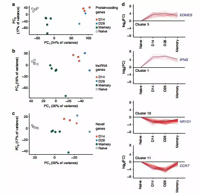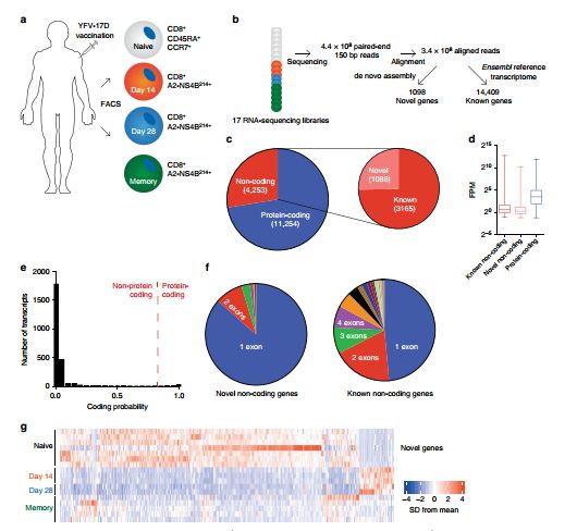 基于之前健康志愿者的測序數(shù)據(jù)(采用YFV-17D黃熱疫苗,分選CD8+T細(xì)胞,收集初始T細(xì)胞,14天CD8+T細(xì)胞、28天CD8+T細(xì)胞、記憶細(xì)胞),進行轉(zhuǎn)錄組分析。鑒定出已注釋的3165個非編碼轉(zhuǎn)錄本,1098個未注釋的。與小鼠數(shù)據(jù)相比,人數(shù)據(jù)中也表現(xiàn)出編碼基因表達(dá)高于非編碼基因。同樣許多鑒定的新轉(zhuǎn)錄本是單外顯子,編碼潛能低于鼠鑒定的轉(zhuǎn)錄本。與小鼠數(shù)據(jù)類似,許多新轉(zhuǎn)錄本在T細(xì)胞分化中表現(xiàn)出特異性。