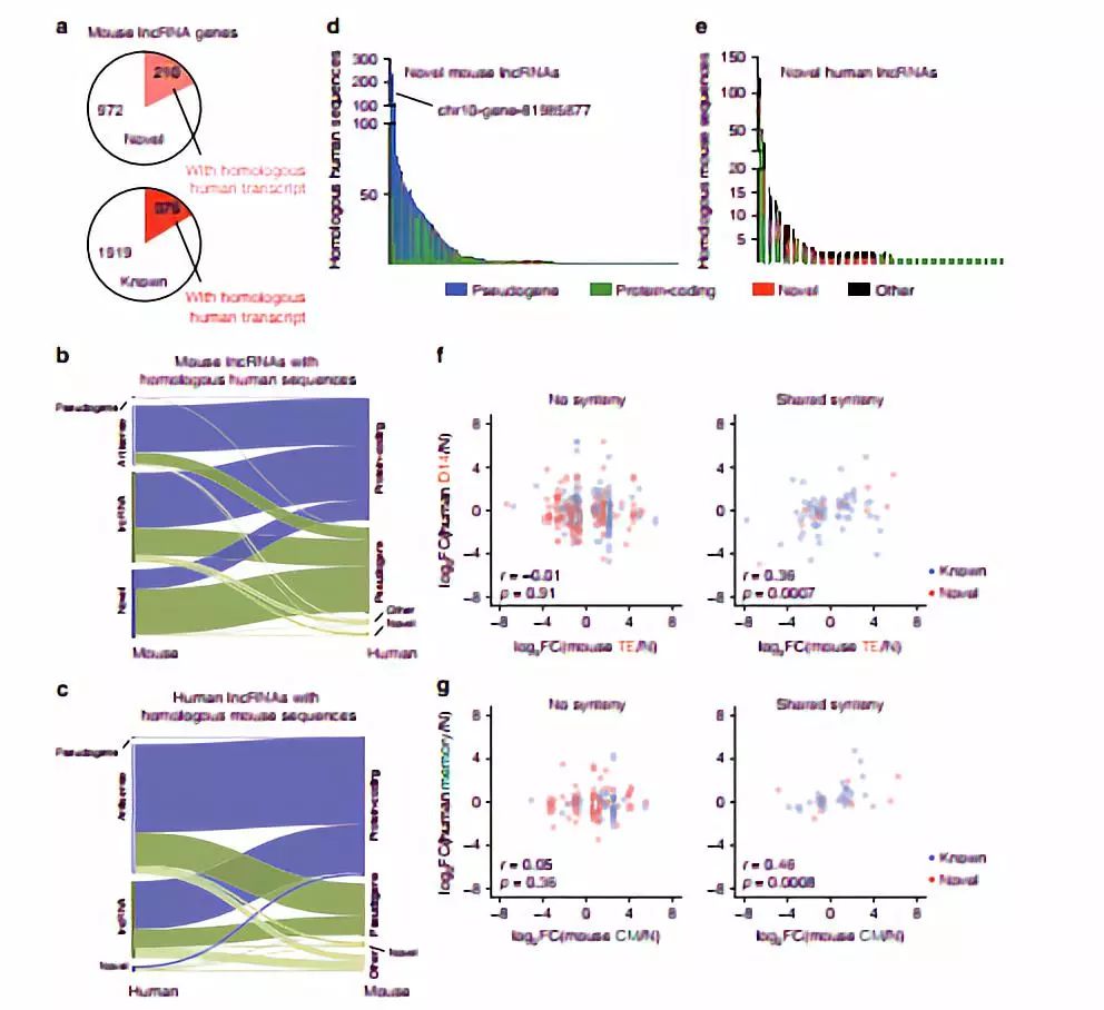 更重要的是,小鼠和人在效應(yīng)及記憶T細(xì)胞分化中已觀察到一些相似的基因程序。這些研究集中于編碼轉(zhuǎn)錄本的水平,但目前關(guān)于非編碼轉(zhuǎn)錄本在這一過程中的表達(dá)變化鮮有報道。作者基于之前工作采用RNA-seq展開研究,以鑒定響應(yīng)病毒感染的人和小鼠CD8 +?T細(xì)胞中長非編碼RNA(lncRNA)表達(dá)的變化。通過lncRNA測序研究,鑒定出上百條未注釋的lncRNA,基于表達(dá)分析可以將lncRNA對初始、效應(yīng)和記憶CD8+T細(xì)胞亞群分類,意味著在抗原啟動分化過程中它們可能參與決定不同分化命運。通過小鼠與人類lncRNA表達(dá)數(shù)據(jù)的比較,發(fā)現(xiàn)具有保守性的lncRNA。