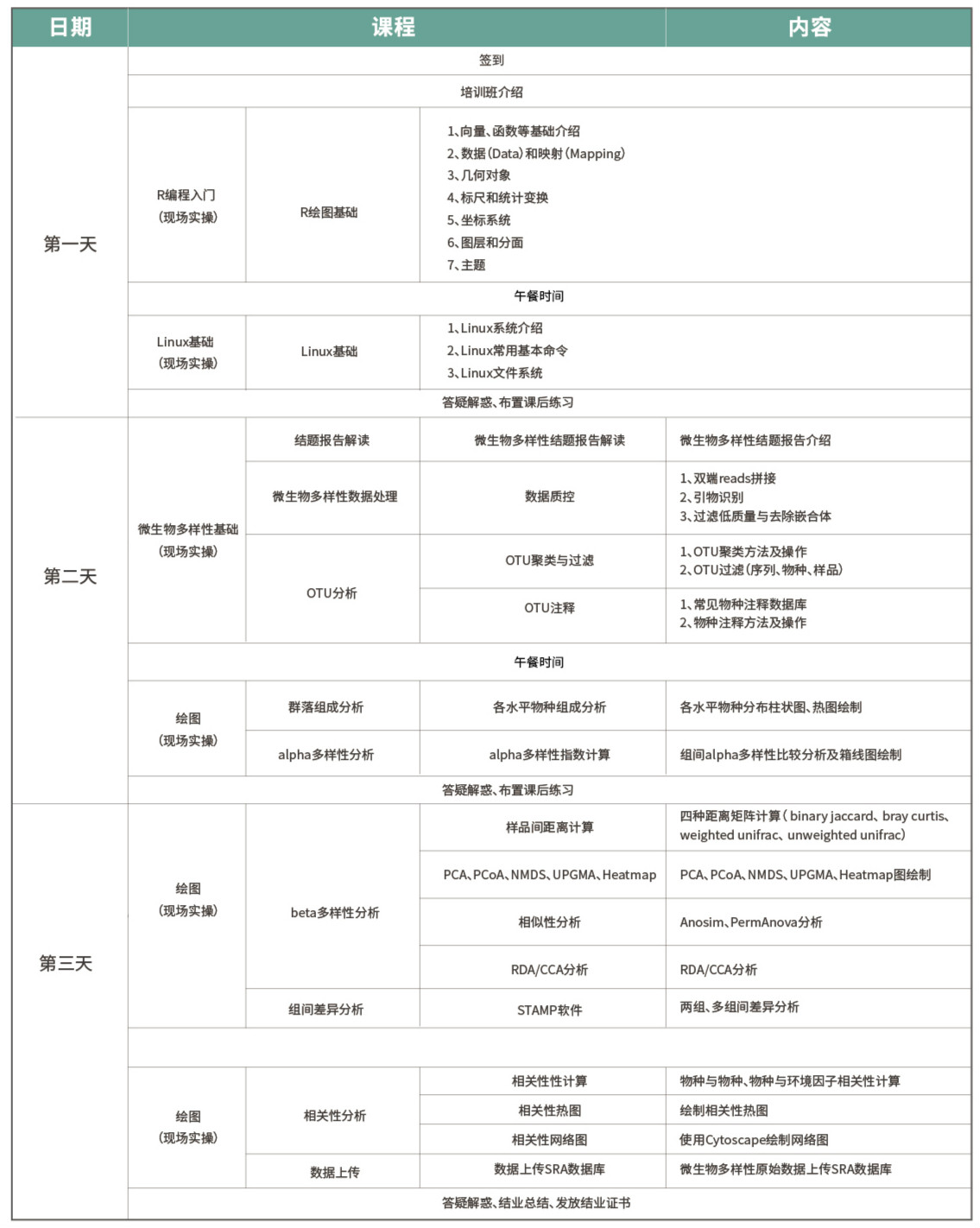本次課程通過采用理論和實踐緊密結(jié)合的教學形式,以理論基礎(chǔ)至數(shù)據(jù)挖掘?qū)訉舆f進的方式,讓大家在短時間內(nèi)對微生物研究中涉及的知識和方法得到迅速提升。同時,在3天課程中,我們現(xiàn)場會有講師與助教與大家面對面的咨詢探討在研究思路、以及分析方面等遇到的問題,從而在多元思維中幫助大家開拓思路,挖掘微生物更多的價值。