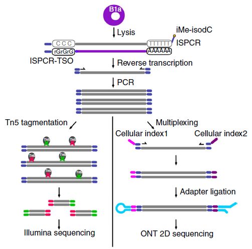 單個基因不同轉(zhuǎn)錄本isoform產(chǎn)生的蛋白質(zhì)具有不同的生物特性,包括穩(wěn)定性、細胞內(nèi)定位、酶活性和翻譯后修飾。Isoform是可選擇性轉(zhuǎn)錄起始位點(transcription start sites,TSS)、轉(zhuǎn)錄終點(transcription end sites,TES)和可變剪接事件等的產(chǎn)物。據(jù)預(yù)測,大部分人類基因存在可變剪接??勺兗艚油蛔兣c人類遺傳病和腫瘤均密切相關(guān)。故而,不僅需要在基因水平鑒定轉(zhuǎn)錄組多樣性,也需要在轉(zhuǎn)錄本表達水平分析細胞真正的轉(zhuǎn)錄多樣性。二代轉(zhuǎn)錄組測序弊端:目前基于二代平臺的短讀長RNAseq方法在識別復雜轉(zhuǎn)錄本isoform方面存在固有限制,因為它們不能測序全長轉(zhuǎn)錄本。相反,轉(zhuǎn)錄本被片段化以進行測序,其產(chǎn)生的單個短reads無法跨越整個轉(zhuǎn)錄本。算法工具可用于從這些reads中組裝完整的轉(zhuǎn)錄本,但不同的組裝算法可能會導致相互矛盾的結(jié)果,整體組裝質(zhì)量良莠不齊。為了克服二代短讀長RNAseq的這種限制,出現(xiàn)了基于三代測序平臺的全長轉(zhuǎn)錄本測序,比如ONT平臺全長轉(zhuǎn)錄組測序技術(shù)。研究表明,在看似同質(zhì)的細胞群體中各個細胞在基因表達方面可能不同。細胞間異質(zhì)性使免疫細胞成為深入分析轉(zhuǎn)錄多樣性的靶標。研究目的:通過使用ONT技術(shù)對全長cDNA分子進行測序,探究小鼠B1a細胞的單細胞轉(zhuǎn)錄組多樣性。