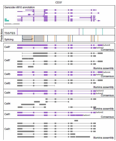 ONT全長轉(zhuǎn)錄組測序優(yōu)于Illumina數(shù)據(jù)組裝轉(zhuǎn)錄本isoform的優(yōu)勢在于從5’端到3’端測序整個cDNA分子的能力。雖然如果基因座僅表達單個isoform,使用Trinity組裝Illumina數(shù)據(jù)可能會成功,但它似乎很難分析包含多個遠距離替代特征的基因座的多種isoform。例如,ONT RNAseq在所分析的各個細胞中鑒定了CD37基因的幾種不同isoform(上圖CD37)。在大多數(shù)情況下,從單個細胞組裝Illumina數(shù)據(jù)時,Trinity無法形成完整的重疊群或產(chǎn)生ONT RNAseq未檢測到的重疊群。因此,CD37基因及其isoform鑒定突出了ONT RNAseq方法的優(yōu)勢,以確定復雜isoform多樣性,超出了短reads技術(shù)的可能性。
