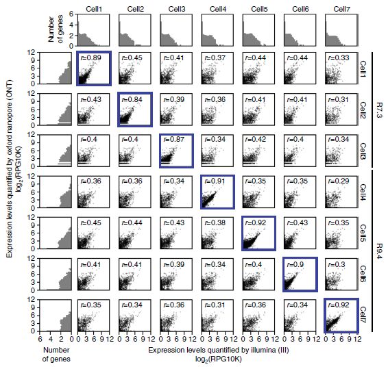 比較相同細胞的Illumina和ONT RNAseq基因表達定量結(jié)果,二者間具有高相關(guān)性(ONT R7.3芯片的Pearsonr相關(guān)系數(shù)≥0.84-0.89和升級版R9.4芯片為0.9-0.92),證實ONT RNAseq方法可復現(xiàn)Illumina基因表達定量。比較不同細胞中的Illumina和ONT RNAseq基因表達定量數(shù)據(jù)顯示,Pearsonr≤0.45的低相關(guān)性,表明ONT RNAseq可以鑒定不同細胞間表達差異。