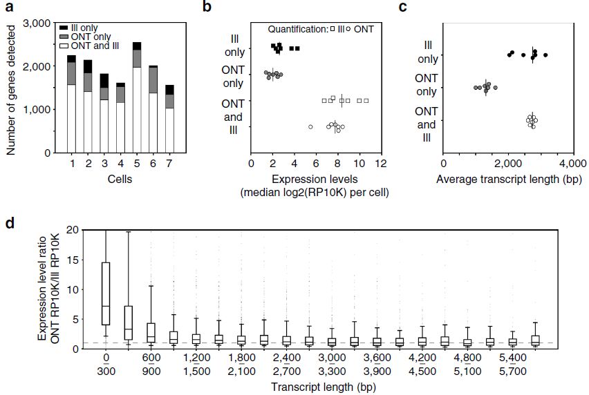 即使產(chǎn)生相對較少的reads數(shù),ONT RNAseq基因表達定量也檢測到了絕大多數(shù)Illumina RNAseq檢測到的基因(下圖a)。此外,7個細胞中的5個,基因表達檢測已達到飽和(下圖S2)。ONT或Illumina RNAseq單獨檢測到的基因表達水平較低,表明這些基因的表達水平接近兩種技術(shù)的檢測下限(下圖b)。還觀察到ONT RNAseq單獨檢測的基因由較短的轉(zhuǎn)錄本組成(下圖c)。此外,長度<600bp并且通過ONT和Illumina RNAseq檢測的基因在Illumina RNAseq數(shù)據(jù)中具有相對較低的表達水平(下圖d)。雖然這與在基于Tn5的Illumina文庫制備中強烈選擇的較短轉(zhuǎn)錄本一致,但不能排除ONT RNAseq可能偏向于較短的轉(zhuǎn)錄本。為排除這種可能性,作者進一步選擇合成轉(zhuǎn)錄本混合物SIRVs,分析轉(zhuǎn)錄本長度是否對ONT RNAseq表達定量有影響。